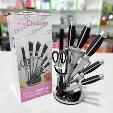 مجموعه چاقوی آشپزخانه برند کینگ دسینی مدل 9 پارچه دارای وزن ایده آل، جنس تیغه و دسته مرغوب و ظاهری زیباست. این مجموعه 9 تیکه از استند، ساطور، چاقوی سرآشپز، چاقوی برش، چاقوی ابزار، چاقوی تکهای، چاقو تیزکن، قیچی مخصوص و پوستکن تشکیل شده است و با ظاهری جمع و جور، زیبایی خاصی به آشپزخانه شما می بخشد.
